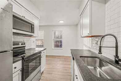 The kitchen has been thoughtfully renovated and showcases crisp white cabinetry, sleek dark countertops, stainless steel appliances, and a classic subway tile backsplash, creating a functional and stylish area perfect for everyday cooking. Durable wood style flooring flows seamlessly through the living areas, adding warmth and low maintenance appeal.