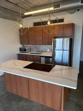 The open-concept layout seamlessly connects the kitchen and living room, perfect for hosting and everyday comfort. Enjoy white stone countertops, stainless steel appliances, a large kitchen island, and new soft-close cabinets. The apartment also features in-unit laundry, tall ceilings, central heat and air, and a spacious closet for plenty of storage.