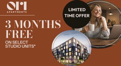 Rent Special available! Up to three months free rent! Limited time promotion! Enjoy up to 3 months free rent* on select studio units. *Restrictions apply.