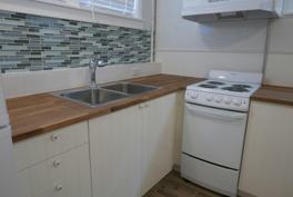 Everything has been updated, including new tile floors in kitchen, new tile bathroom with fixtures, large remodeled shower. Large kitchen has updated plumbing with new, high end cabinets, countertops, sink, faucet, new fridge, new stove. New blinds and four windows bring in lots of natural light.