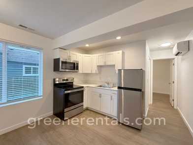 Modern 1 bedroom, 1 bathroom main level apartment on the Eastside. Mini split provides heating and cooling for year-round comfort. Washer & Dryer included. Private fenced in back yard. Driveway parking for 1 small vehicle only. Visitors must park on street. Water, Sewer, and Garbage paid by Landlord and billed back to Tenants.
