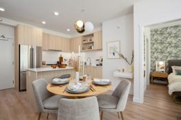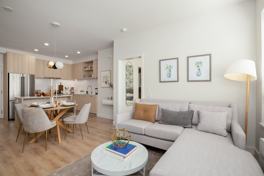 Three thoughtfully designed buildings warmly welcome you home to The Oaks. Contemporary West Coast architecture that feels modern yet approachable is surrounded by lush, private greenspace. Family-friendly one-to-three-bedroom homes with high ceilings, spacious floorplans, and serene, bright interiors create an authentic sense of home within the city.