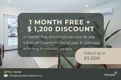 Rent Special available! Up to $5,000 in Value! Premium Incentives at Woodland Place! Year 1: 1 month free, amortized over the 1st year $100 off per month, amortized over the 1st year, total $1,200 value