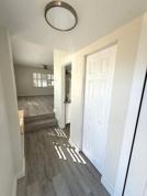 The kitchen features white shaker cabinetry, a sleek modern backsplash, butcher-block countertops, and stainless steel appliances, opening into a light-filled bedroom. The bathroom has been fully updated with a walk-in shower and contemporary fixtures, while luxury vinyl plank flooring flows throughout the home for a cohesive, modern feel.
