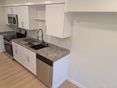 This ground-floor unit boasts a galley kitchen equipped with stainless steel appliances, including a microwave range hood and dishwasher.