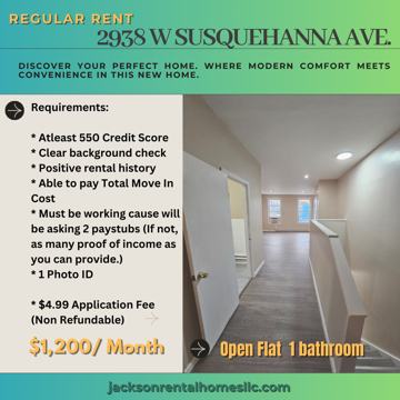 Welcome to 2938 W Susquehanna Ave., a bright and spacious open flat-style studio apartment located in the historic Strawberry Mansion neighborhood of North Philadelphia, available for $1,200 per month. This thoughtfully updated apartment offers a comfortable and modern living space that's perfect for anyone seeking simplicity, style, and convenience. Step inside and you'll immediately notice the new flooring and updated lighting that give the apartment a fresh and welcoming feel. The open layout provides a flexible living space where you can easily create areas for sleeping, relaxing, and dining. Hardwood floors add warmth and character, while ceiling fans help keep the space comfortable year-round. The kitchen and living area flow together seamlessly, making the apartment feel open and airy. The bathroom features clean tile work and a full bathtub, offering a relaxing place to unwind after a long day. Located just two blocks from Richard R. Wright Elementary School and Strawberry Mansion High School, this apartment sits in a convenient location close to neighborhood amenities, public transportation, and local parks. If you're looking for a modern, low-maintenance space in a well-connected North Philly neighborhood, 2938 W Susquehanna Ave. could be the perfect place to call home. $1,200/ Month * New Cabinets and Appliances coming soon. Requirements: * Atleast 550 Credit Score * Clear background check * Positive rental history * Able to pay Total Move In Cost * Must be working cause will be asking 4 paystubs (If not, as many proof of income as you can provide.) * 1 Photo ID * $4.99 Application Fee (Non Refundable)