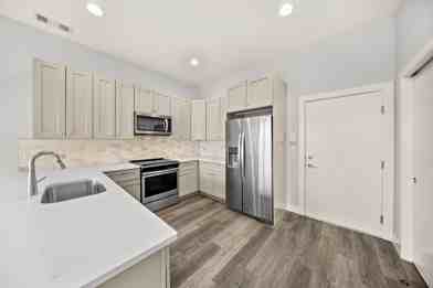 The sleek kitchen is equipped with quartz countertops, shaker-style cabinetry, stainless steel appliances, and a spacious island perfect for entertaining. Generous bedrooms offer plush carpeting and great natural light, while the spa-inspired bathroom showcases elegant tile work and contemporary finishes.