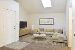 This well maintained, air-conditioned upstairs apartment home features a generous open floor plan, cathedral ceilings, and tinted skylights for abundant natural light. The fully equipped kitchen offers a stove, refrigerator, dishwasher, and ample counter space with a breakfast bar. A spacious walk-in closet and private bedroom deck add convenience and comfort. Enjoy relaxing by the sparkling pool!