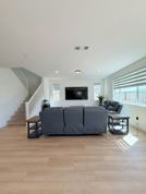The first floor features a private bedroom with its own full bathroom, perfect for multi-generational living or guests. This level also includes a spacious open living and dining room combination, a well-sized kitchen with brown cabinetry and modern appliances, and a convenient half bathroom.