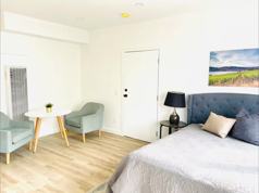 Beautifully renovated studio apartment featuring a bright, open layout with modern finishes throughout. This unit offers a stylish kitchenette with sleek gray cabinetry, quartz countertops, and a stainless steel sink. The living space is spacious enough to comfortably accommodate both a bed and seating area, with large windows bringing in great natural light.