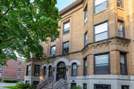 The projected corner bay windows of this delicate yellow brick facade offer abundant light and ample cross-ventilation to the interiors as well as unobstructed views of the streetscape. A solid limestone base combines with a grand Romanesque entryway, both anchoring the building and marking its presence in the center of the neighborhood just a few minutes from Lake Michigan to the east and Washington Park to the west.