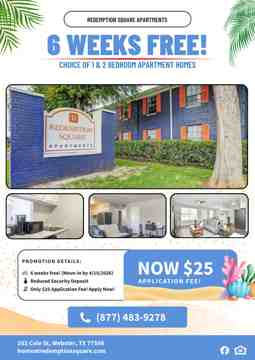 **Get It While It's Hot! 6-Wks Free, Move-in By April 30, 2026!** Welcome to Redemption Square Apartments, where comfort meets charm in the heart of Webster, Texas. Designed for relaxed garden-style living, our welcoming community offers a peaceful retreat with all the conveniences of modern life. Choose from thoughtfully upgraded one- and two-bedroom apartment homes that blend style, functionality, and everyday ease. Enjoy beautifully maintained courtyard, a dedicated and inviting BBQ grilling area—ideal for gathering with friends or unwinding outdoors. An on-site laundry center and attentive, professional on-site maintenance, proudly provided by Emaret Capital Group, ensure a seamless living experience. Perfectly situated just minutes from Galveston's stunning coastal waters, Webster Medical Center and the Kemah Boardwalk, Redemption Square offers the ideal balance of comfort, convenience, and connection. Discover a place you'll be proud to call home.
