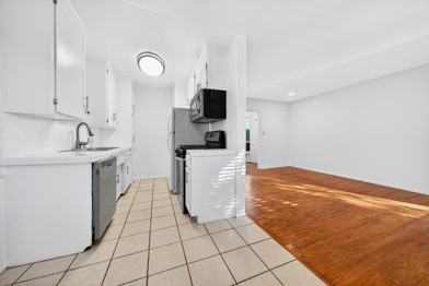 White tile countertops with stainless steel appliances including gas stove/oven, over-the-range microwave, and dishwasher (white refrigerator optional). Stainless steel sink with tall spout faucet, abundant updated cabinetry, light fixture, and ceramic tile flooring.