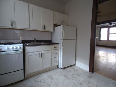 Apartment interiors include a kitchen with new cabinets and and counter-tops, a gas range, refrigerator, spacious living room and bedroom. This apartment has several windows to brighten up your living space, hardwood floors, ample closet space and ceiling fans.