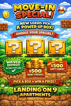 Rent Special available! Hit Start on Your New Home! Apply and Pick a Mystery Box to unlock your reward: $500 Rent Credit $500 Gift Card $0 Deposit on approved credit Power-ups are waiting… which box will you choose?
