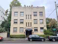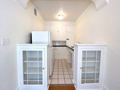 Full of period charm, this top-floor studio at the Park Regent offers classic details and modern touches. Beautiful hardwood floors and arched doorways lead into a bright kitchen and dining area, where a tiled backsplash, checkered flooring, and updated appliances complement the vintage style. A glass-fronted china cabinet provides a graceful separation between kitchen and dining space.