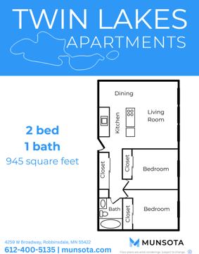 Twin Lakes Apartments is located just half a block from the vibrant heart of downtown Robbinsdale, MN—a charming, walkable “Eat Street” known for its local restaurants and small-town feel, all just 10 minutes from downtown Minneapolis. Our one- and two-bedroom apartment homes come with oversized layouts (they're huge!) and generous closet space. Residents enjoy off-street parking, on-site laundry, professional management, and convenient access to parks, shopping, dining, and major highways. Twin Lakes Apartments offers a comfortable, connected lifestyle in a friendly neighborhood setting.