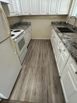 This unit is ready for move-in. Downstairs. It is part of a 5 unit building. 1 bedroom, 1 bath with separate living and dining room. 1 assigned covered carport. It has been professionally cleaned. Carpet shampooed. LVT in bathroom and kitchen floor. Fauxwood blinds. Kitchen with white cabinets and granite counters.