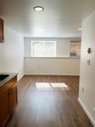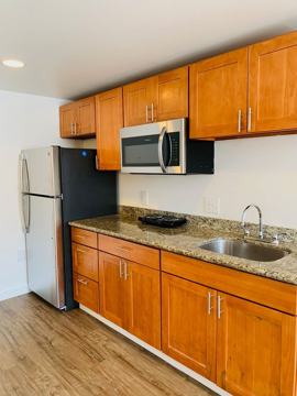 This trendy studio home features an open floor plan with designer hardwood style flooring throughout, granite counters, a full size stainless steel fridge, a double countertop hot plate cooker, full size stainless steel microwave and one full bathroom.