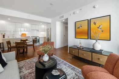 1-bed/1-bath offering a blend of modern design and functional luxury . Featuring eastern exposures, the space is filled with natural light through floor-to-ceiling windows. The chef's kitchen is equipped with premium Bosch stainless appliances, quartz countertops, and sleek modern cabinetry - creating an ideal space for cooking and entertaining. The open-concept layout includes wide-plank hardwood floors, while the bathroom showcases designer tile, a shower-over-tub with a glass enclosure, and high-end fixtures. A laundry center adds further convenience. amenities include a rooftop terrace with panoramic city views, BBQ area, concierge front desk for packages and security, a private lounge, conference rooms, bike storage.