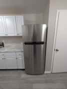 Beautiful kitchen with stainless steel refrigerator and stove