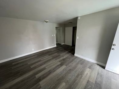 The living room provides a comfortable space to relax and flows easily into the kitchen area. Large windows bring in plenty of natural light, making the home feel bright and inviting. The bedroom offers good closet space and enough room for a full bedroom setup.
