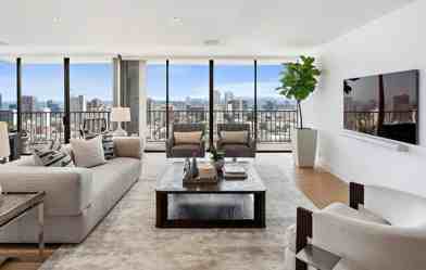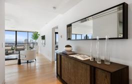 Atop Russian Hill, this elegant corner residence at The Summit offers mesmerizing views of the downtown skyline, Bay Bridge, and Sutro Tower. Located on the tower's southeast corner, the stunning vistas are showcased through floor-to-ceiling windows and a walkout balcony. Redesigned to a contemporary European standard, the layout features a corner-view great room with custom white oak flooring by Schotten & Hansen, and a bespoke Bulthaup kitchen with matte-finished stainless steel countertops and cabinetry, custom lighting, Gaggenau appliances, Sub-Zero double-door wine cooler, and workstation. The oversized bedroom suite boasts panoramic views and a walk out terrace and has potential to be redesigned to include an additional bedroom or office. Renderings of plans for a potential two bedroom layout are supplied. Additional features include a powder room, radiant floor heating, Lutron lighting and shade controls, Sonos sound system, and two home theater systems with Sonos sound bars. Amenities include a same-floor storage unit and laundry room, and one-car parking. Situated on one of Russian Hill's flattest blocks, 999 Green offers a 24-hour attended lobby designed by ODADA, an open-air patio at the plaza level, a dog walk, and professional on-site management.
