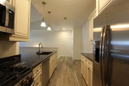 -Modern kitchen with granite countertops, dishwasher, and built-in microwave.