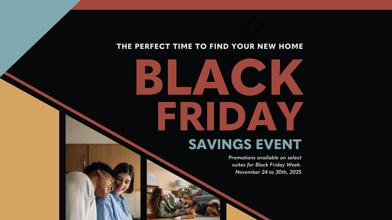 Rent Special available! Black Friday Savings! $500 Move-In Bonus! Black Friday Savings Event! November 24-30! Rent one of our select suites and receive a $500 Move-In bonus!* *Select suites only. Based on availability. Errors & omissions excepted. Not valid with any other offer or promotion. Subject to change without notice. Discount applies to the base rent