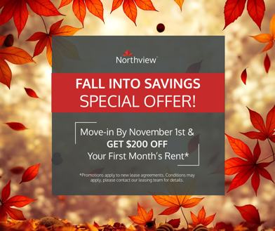 Fall Into Savings Special - Move in by November 1 and save $200 off your first month's rent