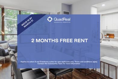 Rent Special available! 2 Months Free Rent Applies to select suites for new applicants only. Terms and conditions apply. Contact the Community Team for more information.