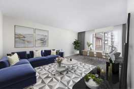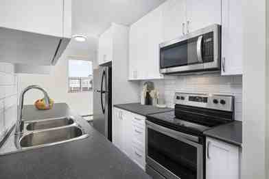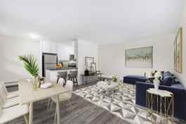 Residents enjoy spacious studio, 1 bedroom, and 2 bedroom suite designs that include refinished hardwood flooring in the living rooms and bedrooms. Kitchens offer stone-like ceramic tile, elegant white cabinetry, self-closing drawers, and four stainless-steel appliances.