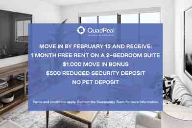 Rent Special available! No Pet Deposit Applies to select suites for new applicants only. Terms and conditions apply. Contact the Community Team for more information.