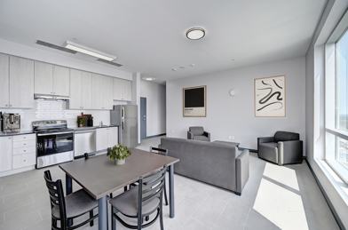 This luxury student community includes a spacious kitchen area and living space, ensuite bathrooms and lots of storage space! A mix of laminate and tile flooring finishes complement the stylish kitchen amenities including modern granite countertops & chic fixtures. These fully furnished apartments include 5 bedrooms and individual bathrooms. Known for its sweeping views, floor to ceiling windows and modern paint pallet throughout, the MARQ at 1 Columbia Street is one of the most sought-after places to live in Waterloo!
