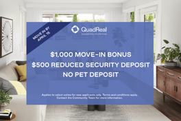Rent Special available! $500 Reduced Security Deposit Applies to select suites for new applicants only. Terms and conditions apply. Contact the Community Team for more information.