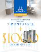 Rent Special available! 1 Month Free + $1,000 Grocery Gift Card Lease any apartment in City Place I or City Place II and receive your first month free and a $1000 grocery gift card when you move in