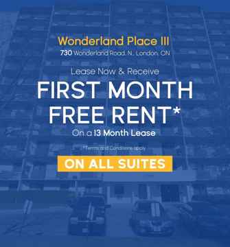 If you're looking for an affordable London Ontario Apartments in a great location with an easy bus ride or drive to Western, the downtown scene, or shopping, then check out Wonderland Place III. In addition to a great location and low price, each apartment features dishwashers, walk-in closets, and balconies that offer incredible city views from the upper floors. All apartments are cable and internet ready for your convenience, and our variety of floorplans for our one and two-bedroom apartments give you options to choose from. Whichever floorplan and price point suits you best, you'll always have access to the building's amenities that make Wonderland Place III stand out as an affordable London Ontario Apartments.