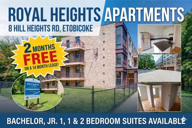 Royal Heights Apartments is located north of Berry Rd just off Park Lawn Rd in a vibrant rental community ideal for families and millennials! This area offers a variety of amenities such as schools, shops, banks and eateries all within minutes of the property. If you’re one to appreciate nature, enjoy a bike ride or walk the dog through South Humber Park, just around the corner! Public transit along with entry to the Gardiner is extremely convenient if you need quick accessibility to downtown Toronto. Don’t miss out on our affordable condo-inspired suites in such an impeccable area!