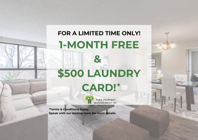 Rent Special available! Special Offer! Get 1-month free rent, on select suites