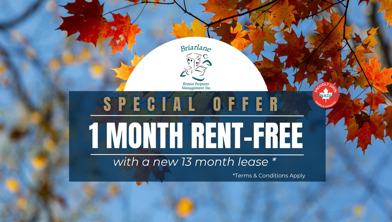 Rent Special available! First Month Rent Free! Receive your FIRST MONTH RENT FREE! This limited time offer is available for new applications on select suites with a 13 month lease term. Contact our leasing agent for further details!