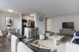 Fully renovated spacious suite with open-concept kitchen featuring chrome accents, breakfast bar, hard surface countertops, undermount double sink, and glass backsplash. Stainless-steel Refrigerator, Stove, Dishwasher (in select units) & Microwave are included.