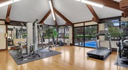 Residents enjoy exclusive access to a fitness centre flooded with natural light, overlooking the outdoor swimming pool, perfect for relaxation and recreation.