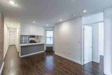 Four Bedroom with Windowed Kitchen and Bath. Apartment features stainless steel appliances, open pass thru kitchen with breakfast bar, plank flooring, recessed lighting, and exposed brick in the living room.