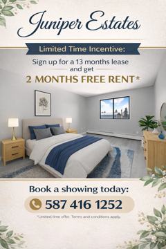 Welcome to Juniper Apartments! Limited-Time Offer: Sign a 13-Month Lease and Enjoy 2 Months of FREE Rent! (Free rent applied to the 2nd and last month’s rent) Amenities & Features • Spacious, well-maintained suites with bright, functional layouts • Units with durable laminate flooring available • Residents enjoy clean, upgraded common areas throughout the building • Pet-friendly community – cats and small dogs welcome • Heat and water included • Affordable surface parking – $25/month • Suites equipped with essential appliances, including stove and fridge • Professional maintenance team with 24/7 emergency service line • Convenient shared laundry facilities located within the building • Clean, professionally managed common areas • Professional Video surveillance security for added peace of mind • Tenant referral program – refer a friend and enjoy rewards! • Exclusive 25% discount on TELUS services, including high-speed internet, TV, and home phone Neighborhood Juniper Apartments is ideally located in west Edmonton, offering a balance of quiet residential living and everyday convenience. • Minutes from West Edmonton Mall, featuring shopping, dining, and entertainment • Close to Meadowlark Shopping Centre with grocery stores, pharmacies, and medical services • Near Jasper Place Transit Centre with easy access to major bus routes • Quick access to Stony Plain Road and Whitemud Drive for convenient commuting • Nearby green spaces such as Britannia Youngstown Park, perfect for walking and outdoor enjoyment • Short drive to downtown Edmonton, schools, fitness centres, and daily amenities • A well-established neighborhood with a strong community feel About the Property Juniper Apartments offers spacious, well-cared-for suites in a welcoming west Edmonton community. Designed for comfort and convenience, the property combines practical amenities, a pet-friendly atmosphere, and a location close to everything you need. Whether you’re commuting, studying, or enjoying nearby shopping and parks, Juniper Apartments makes everyday living easy. Take advantage of our limited-time 13-month lease incentive and make Juniper Apartments your next home! Professionally managed by MyVic Property Management Book a showing today! Call 587-416-1252