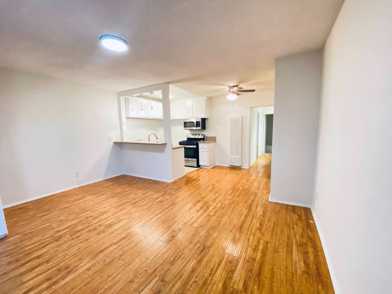 The spacious living room features fresh paint, wood floors, a wall A/C unit, wall gas heater, large window with faux wood horizontal blinds, a closet with sliding mirrored doors, and a breakfast bar with pendant lighting overlooking the kitchen.