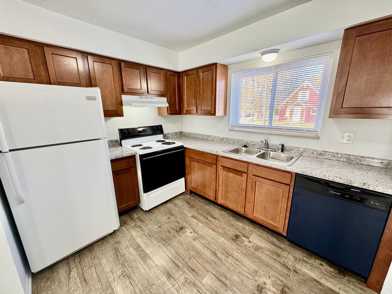 Large remodeled kitchen w/double sink, disposal, dishwasher, full size refrigerator and electric stove
