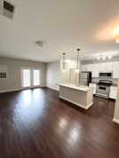 Enjoy a well-equipped kitchen featuring a stove and a versatile kitchen island — ideal for cooking, entertaining, or extra prep space. The apartment boasts beautiful wood floors throughout the main living areas, while the carpeted bedroom adds a cozy touch for ultimate comfort. The modern, tiled bathroom adds a touch of elegance, and an in-unit washer and dryer make laundry days effortless.