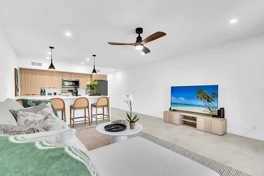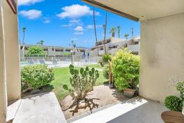Completely remodeled 1-Bed/1-Bath Condo in the iconic Smoke Tree Racquet Club in South Palm Springs. This ground-level corner unit features a sleek open floor plan with 24x48' porcelain tile throughout. The brand-new chef's kitchen includes custom European cabinetry, white quartz counters, a waterfall island, and Maytag stainless steel appliances--perfect for cooking and entertaining. The spacious bedroom offers an in-closet washer/dryer hookup and ceiling fan. The updated bathroom includes a porcelain and marble tiled shower, European vanity, and modern fixtures. New recessed lighting and fresh paint add to the clean, contemporary look. Enjoy stunning sunset views from your private patio. The community offers resort-style amenities including a pool, spa, and 4 tennis/pickleball courts with mountain views. Conveniently located across from the SmokeTree shopping center (Ralph's, Starbucks, Native Foods, more) and just minutes from downtown Palm Springs.
