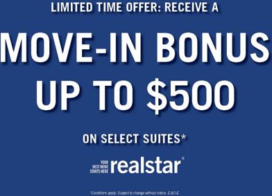 LIMITED TIME OFFER: RECEIVE A MOVE-IN BONUS UP TO $500 ON SELECT SUITES!*