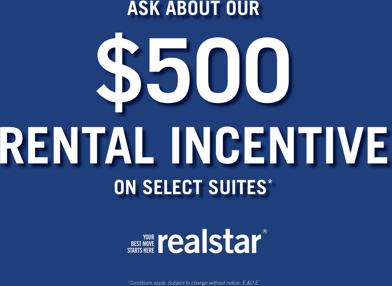 Rent Special available! $500 RENTAL INCENTIVE ON SELECT SUITES!*